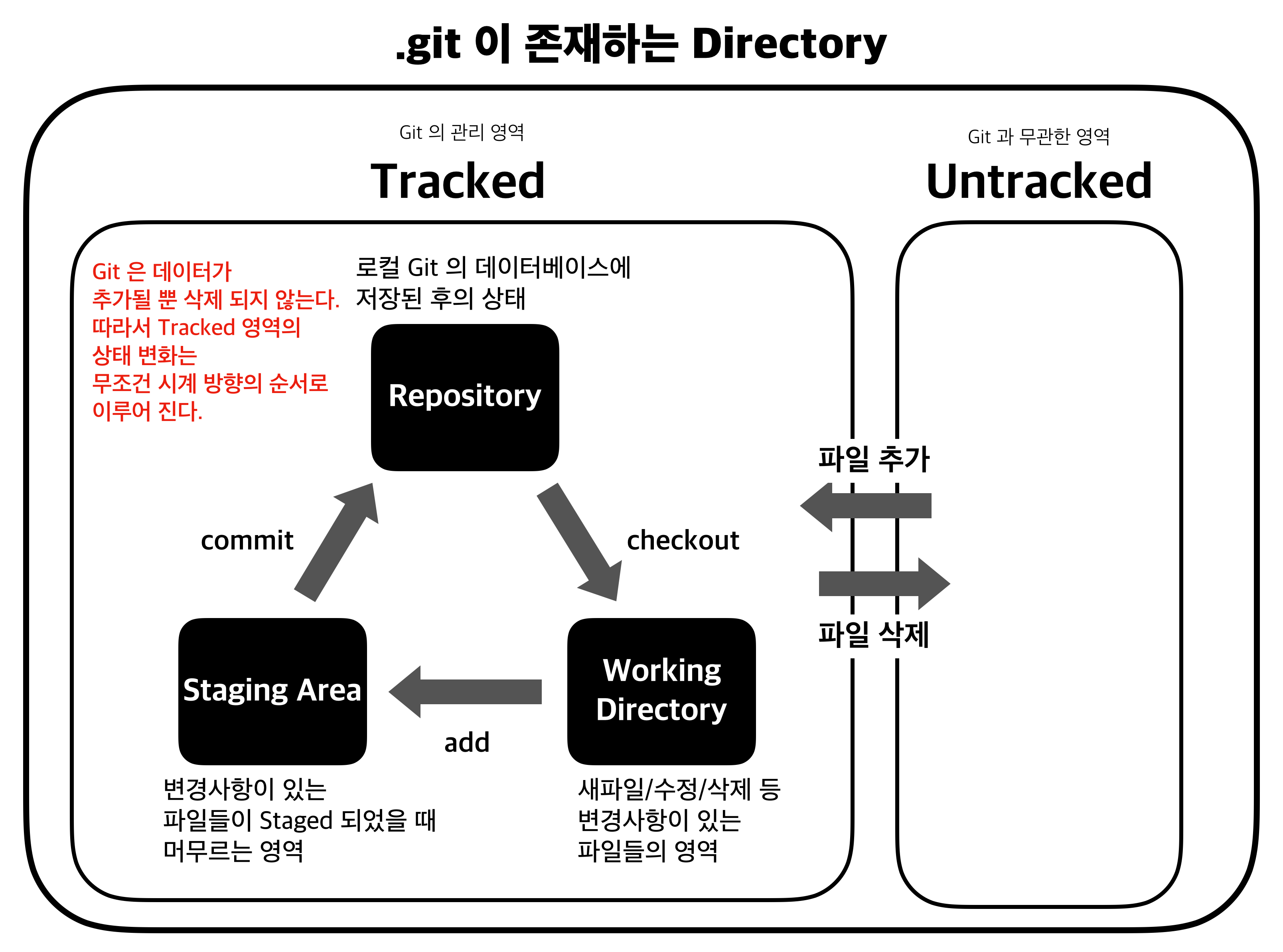 위 그림에서 파일 추가 및 파일 삭제는 Git 의 관점에서의 삭제이다. 디렉터리 내에서는 파일이 항상 존재한다.