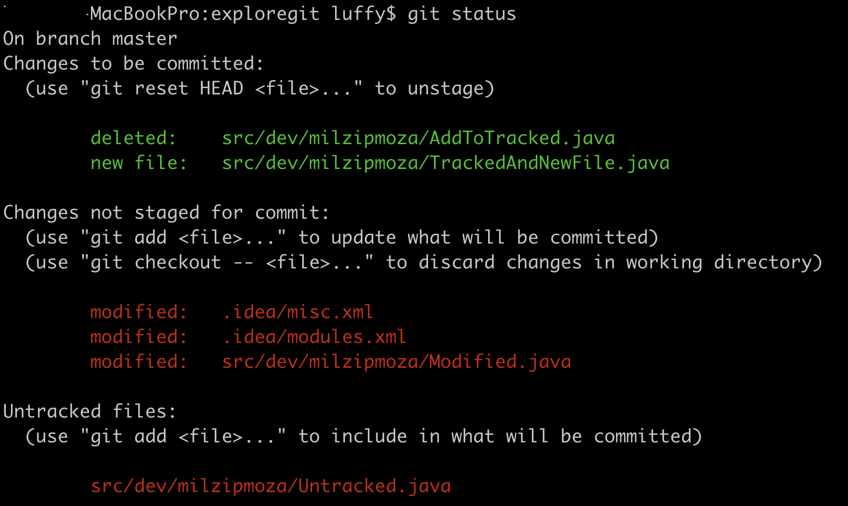 그 아래는 Staged 가 되지 않은 상태의 파일들(Working Directory)을 보여준다. 맨 위의 영역 (Changes to be committed) 에 있는 파일들은 git add [파일명] 으로 staging area 로 옮길 수 있는 파일들이다.